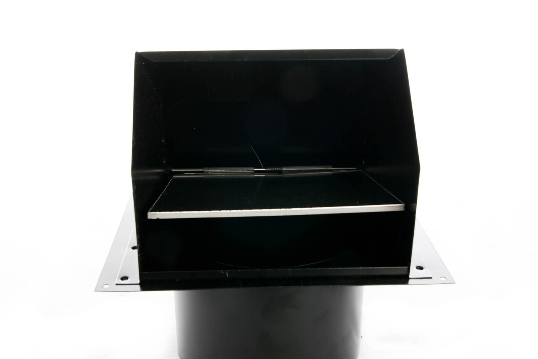 The FAMCO WVEBH6 hooded wall vent with screen, damper, spring & gasket - HD powder coat black 6 inch is primarily used for air exhaust applications. The big mouth hood offers less restriction to air flow. Quality constructed from heavy-duty 24 gauge G90 galvanized steel with a black powder coat finish. This vent comes with a built-in spring loaded damper, gasket and removable ¼ bird screen to prevent many kinds of insects and birds from accessing the hood, and also features a built-in backdraft damper.