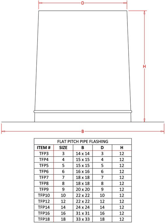 The FAMCO TFP tall pipe flashing - flat pitch roof is made to go over the pipe on a flat roof. This product has a 12 inch rise. Tall model lends to extra clearance where applicable. Quality constructed from 28 - 24 gauge galvanized steel, depending on size. Please note: this product is note designed to be used as a base to hold a cap or vent as is only intended to shield the pipe, please see our FB round vent base for a cap-mounting option